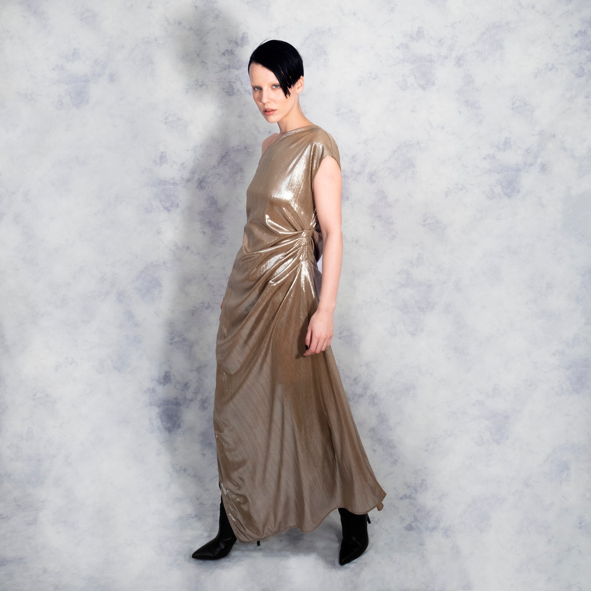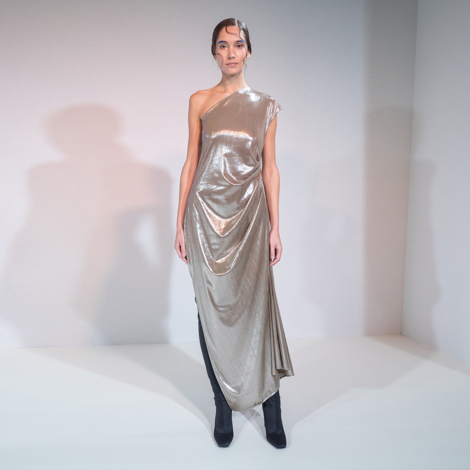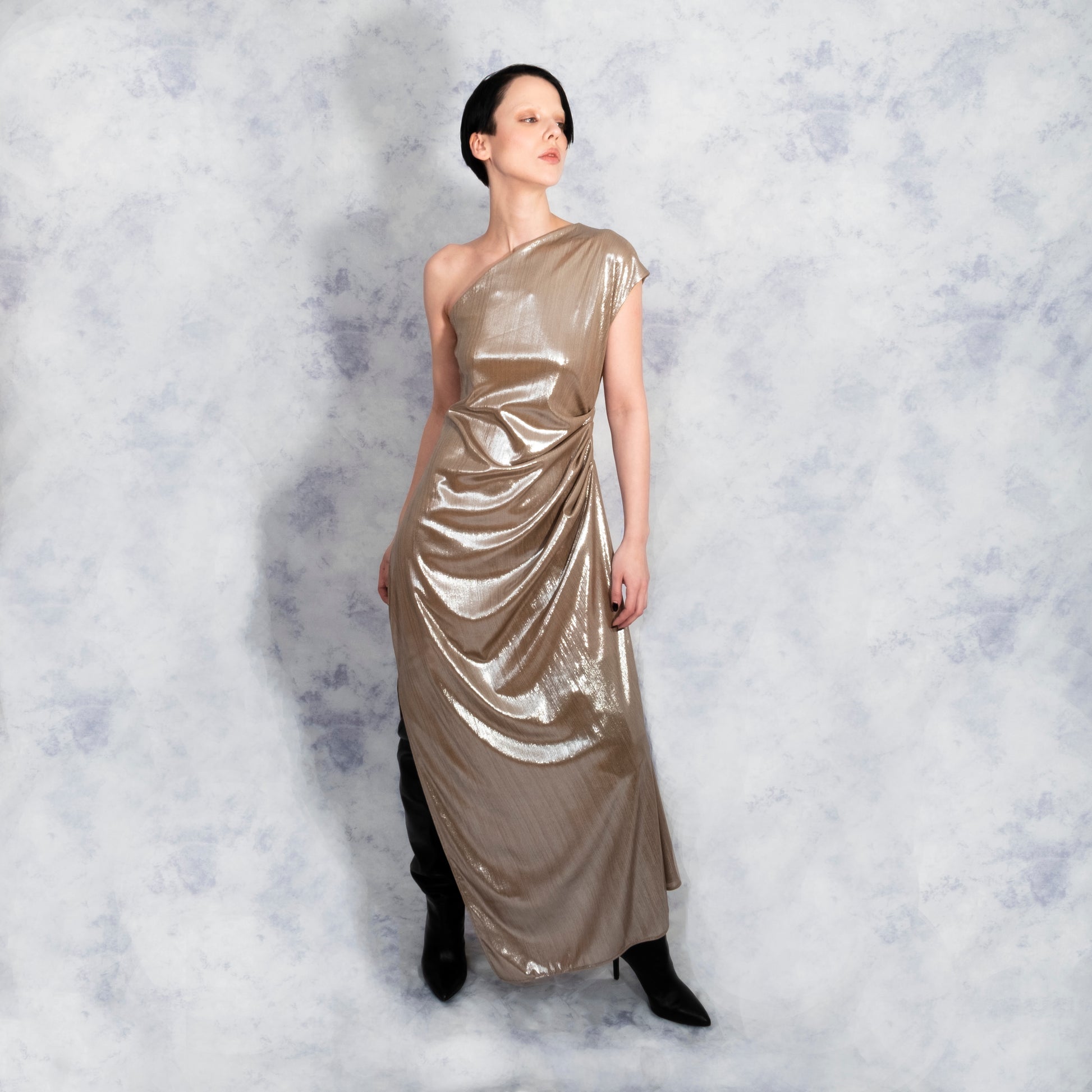 Elegant one-shoulder dress with an asymmetric hemline and hand-draped waistline to flatter any form and accentuate curves. This dress is lined using two layers of the same fabric, creating a double layer of movement and support. The fabric is a beautiful gold-coated ribbed jersey.