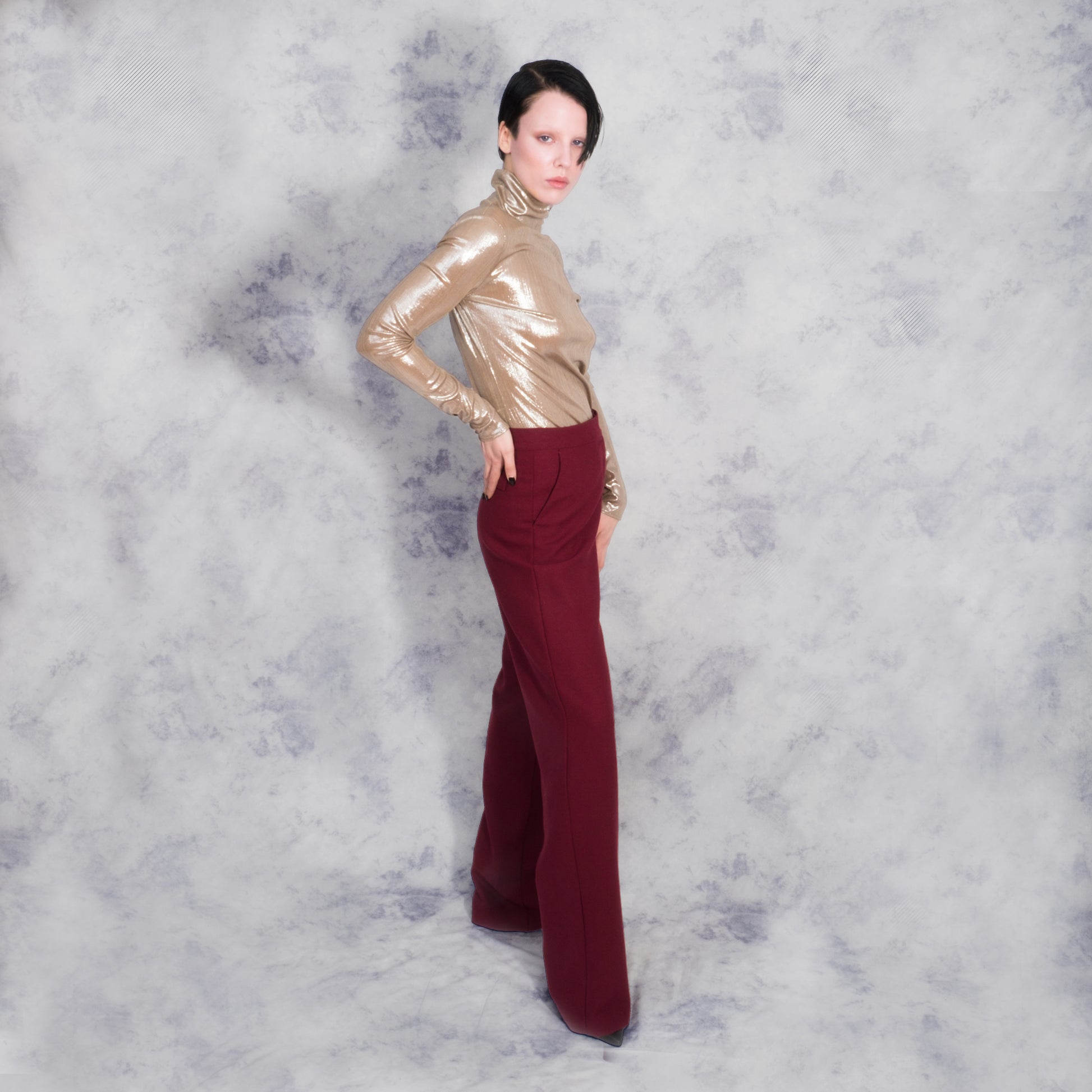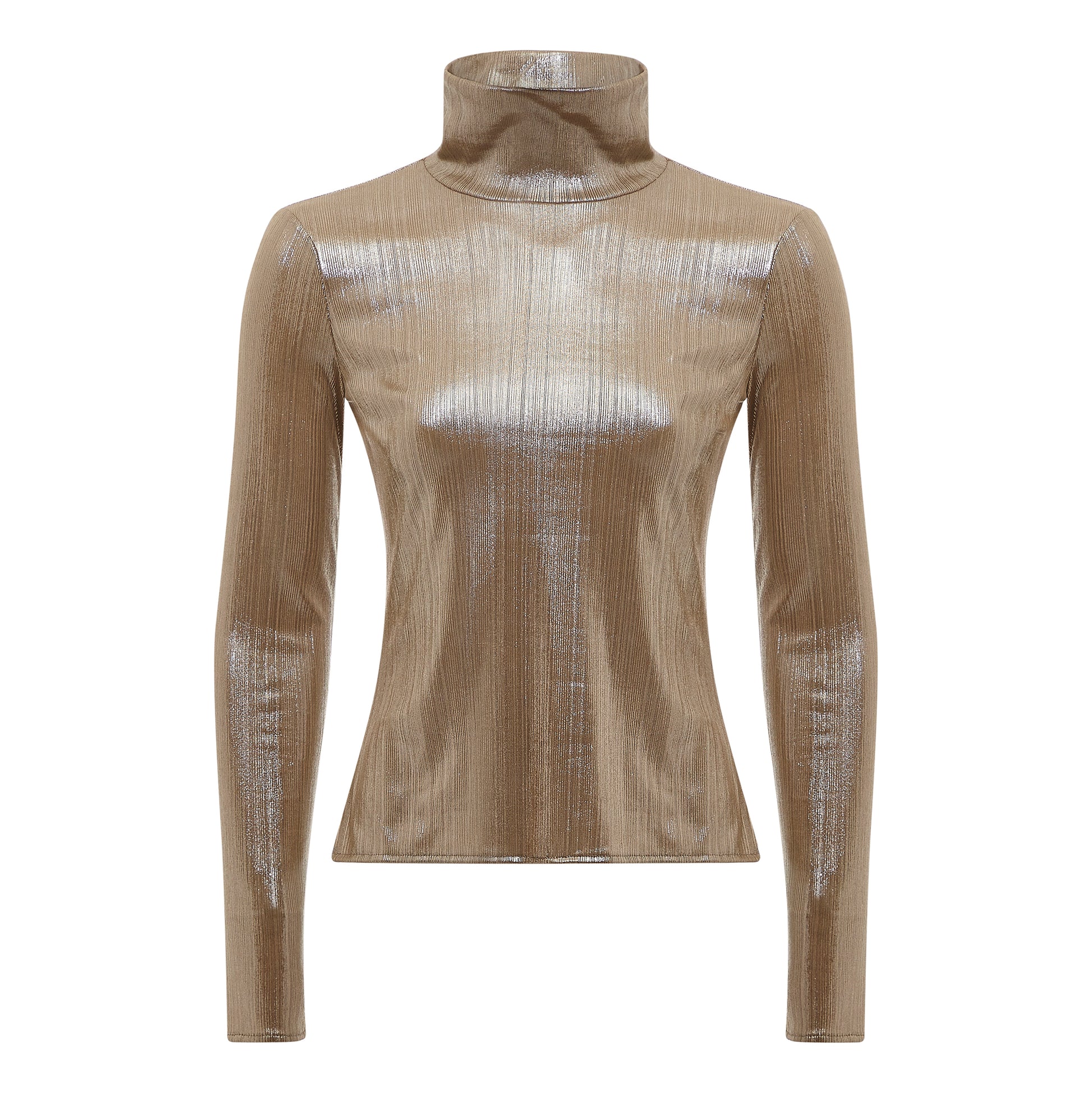 High neck long sleeve polo neck top in shimmering reflective fabric. The fabric is a beautiful high-quality foil coated ribbed jersey with two-way stretch.