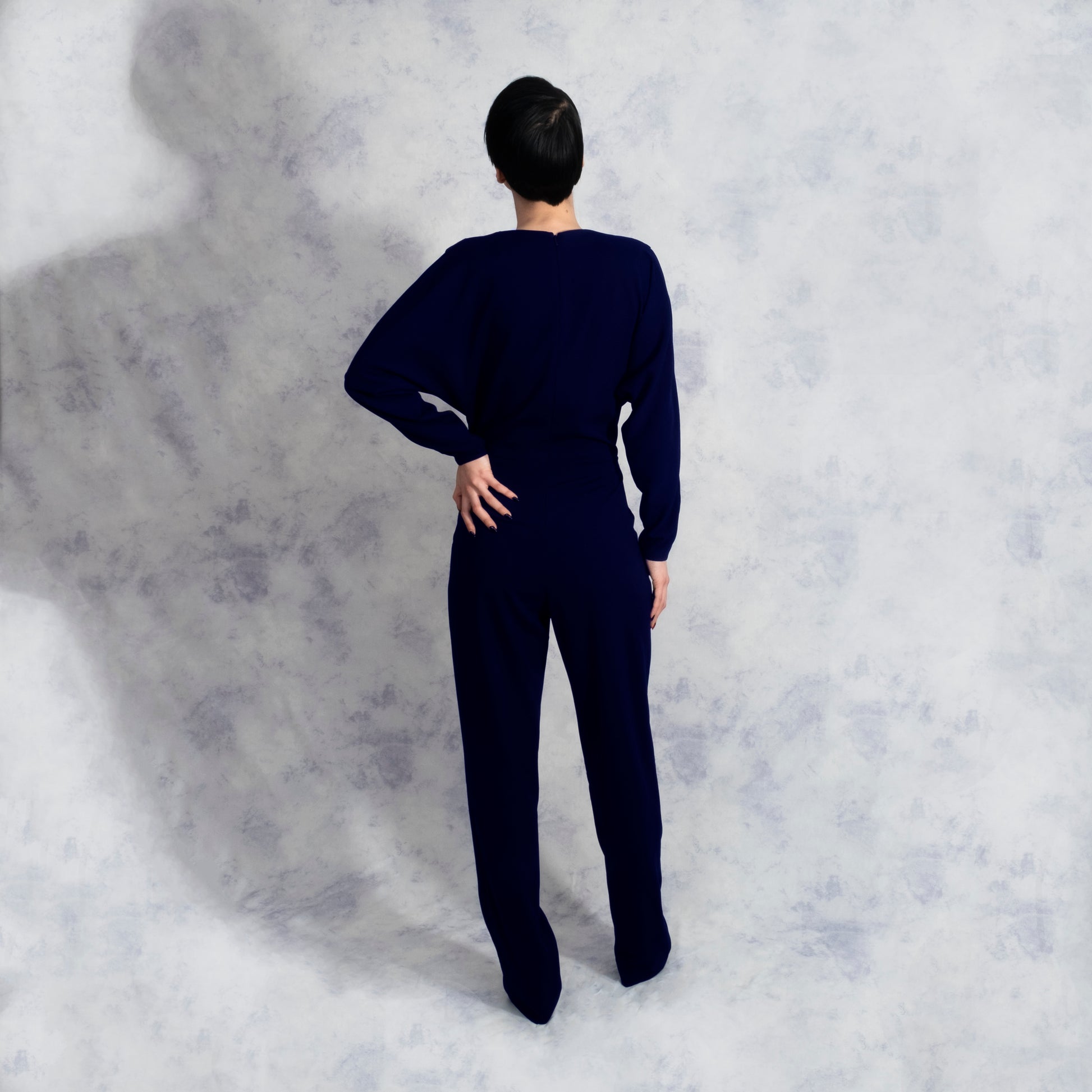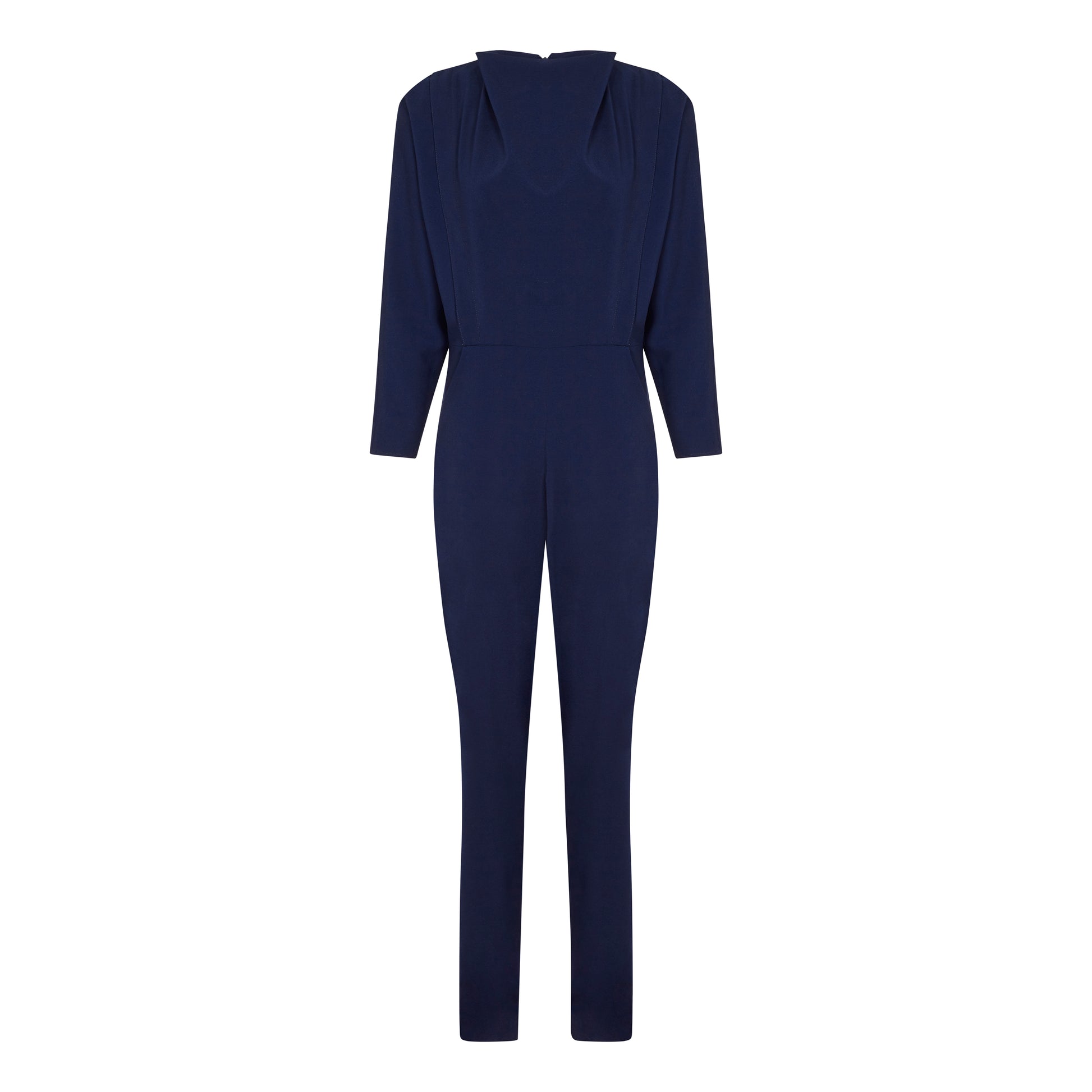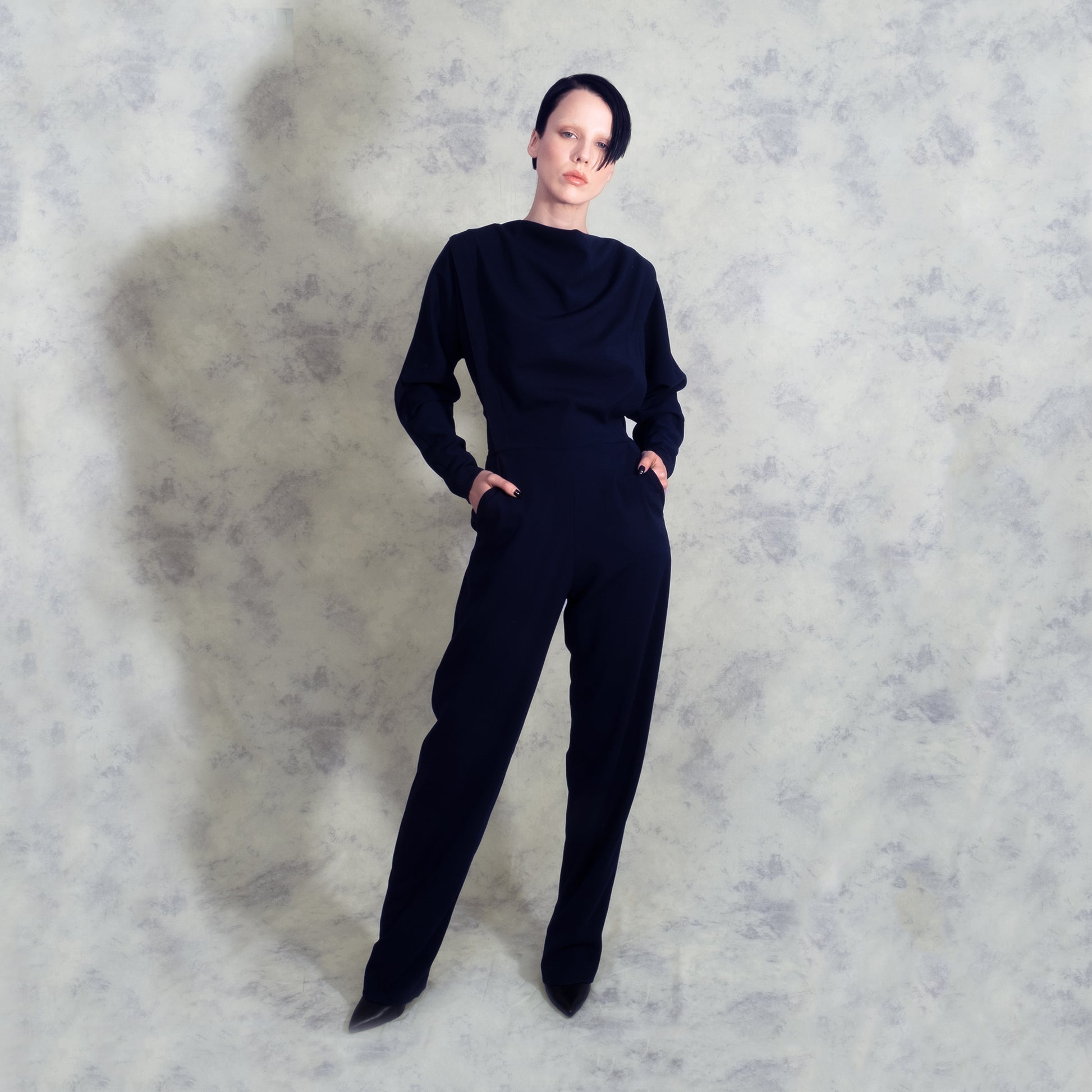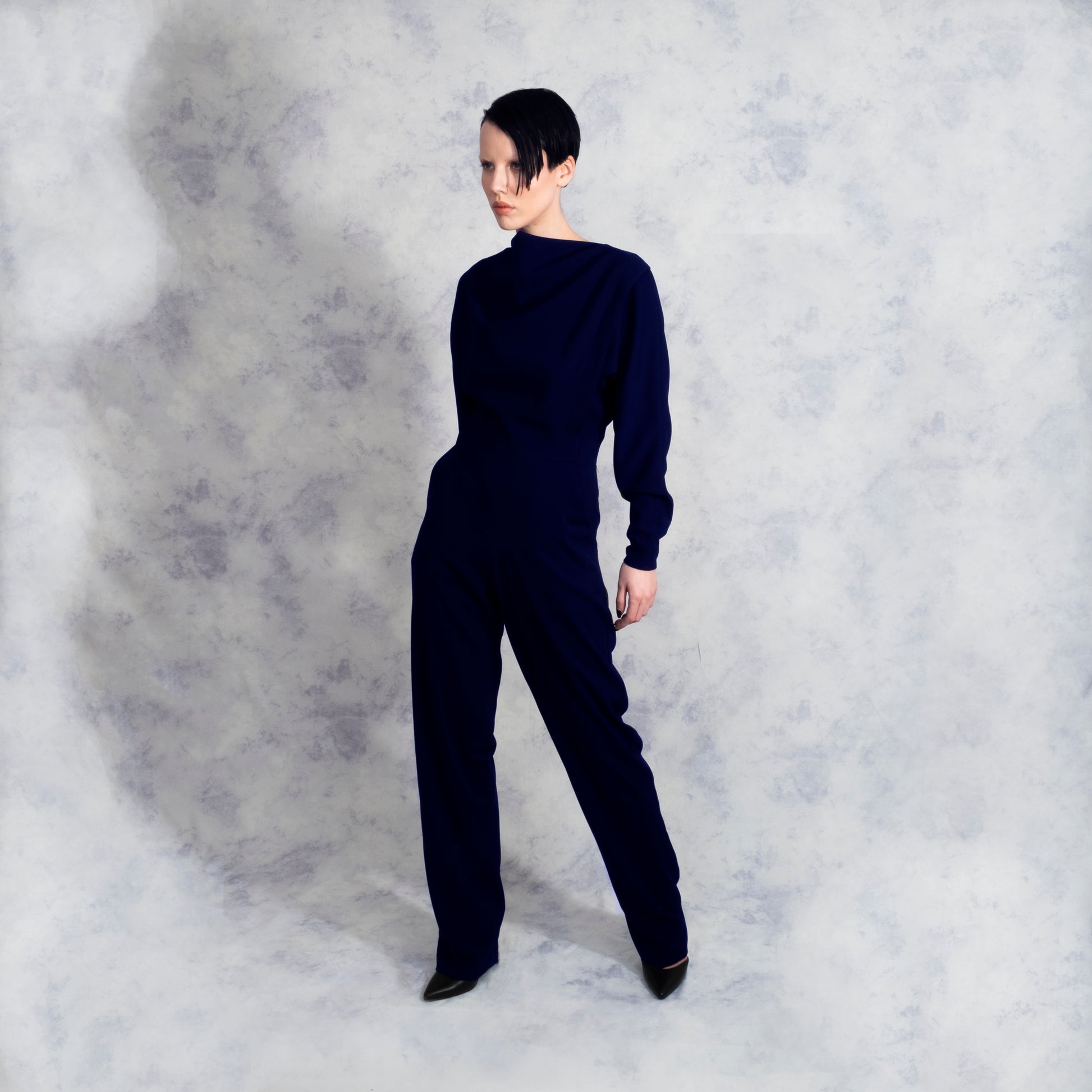 This elegant and comfortable long-sleeved jumpsuit, is made from silky Italian poly crepe with a satin baselining. The woven fabric has great drape and a slight stretch, with anti-creasing technology. The jumpsuit has hip pockets, tapered trousers and a high cowl neckline with flattering detailing on the front and a full-length concealed zip on the center back, allowing you to step into the garment with comfort and ease.