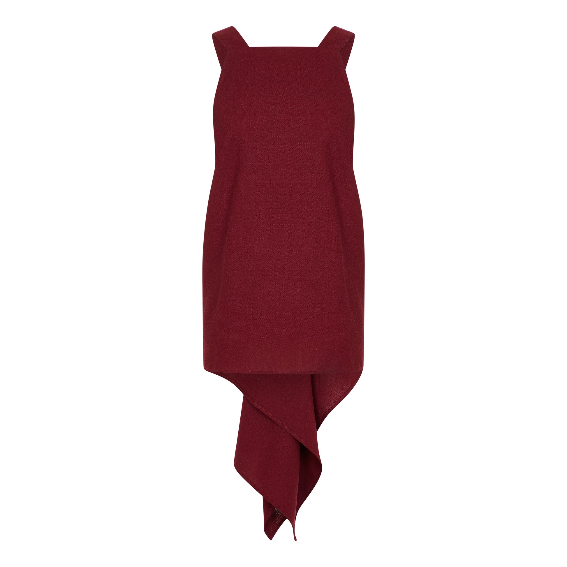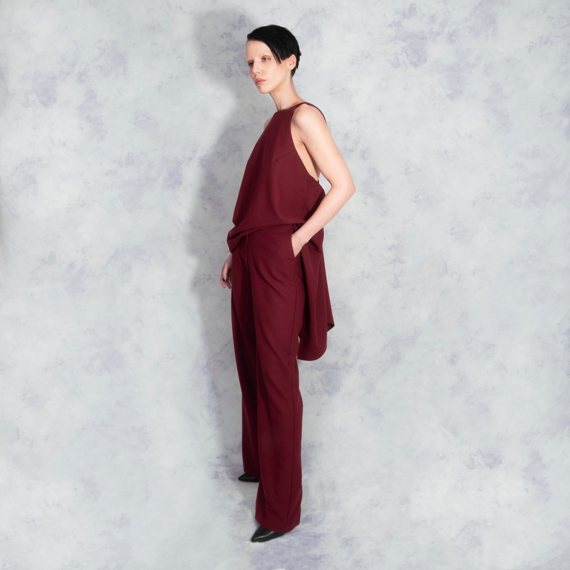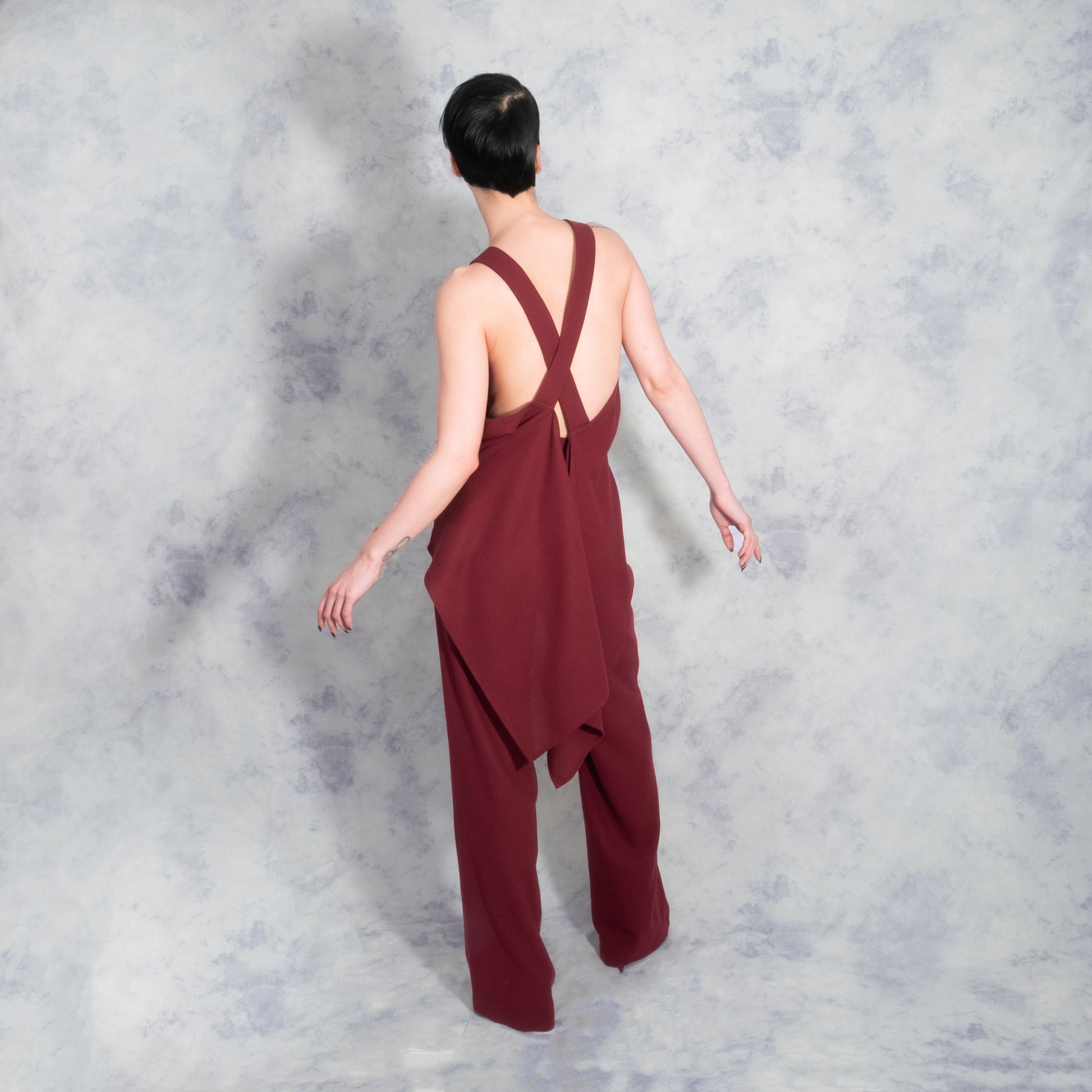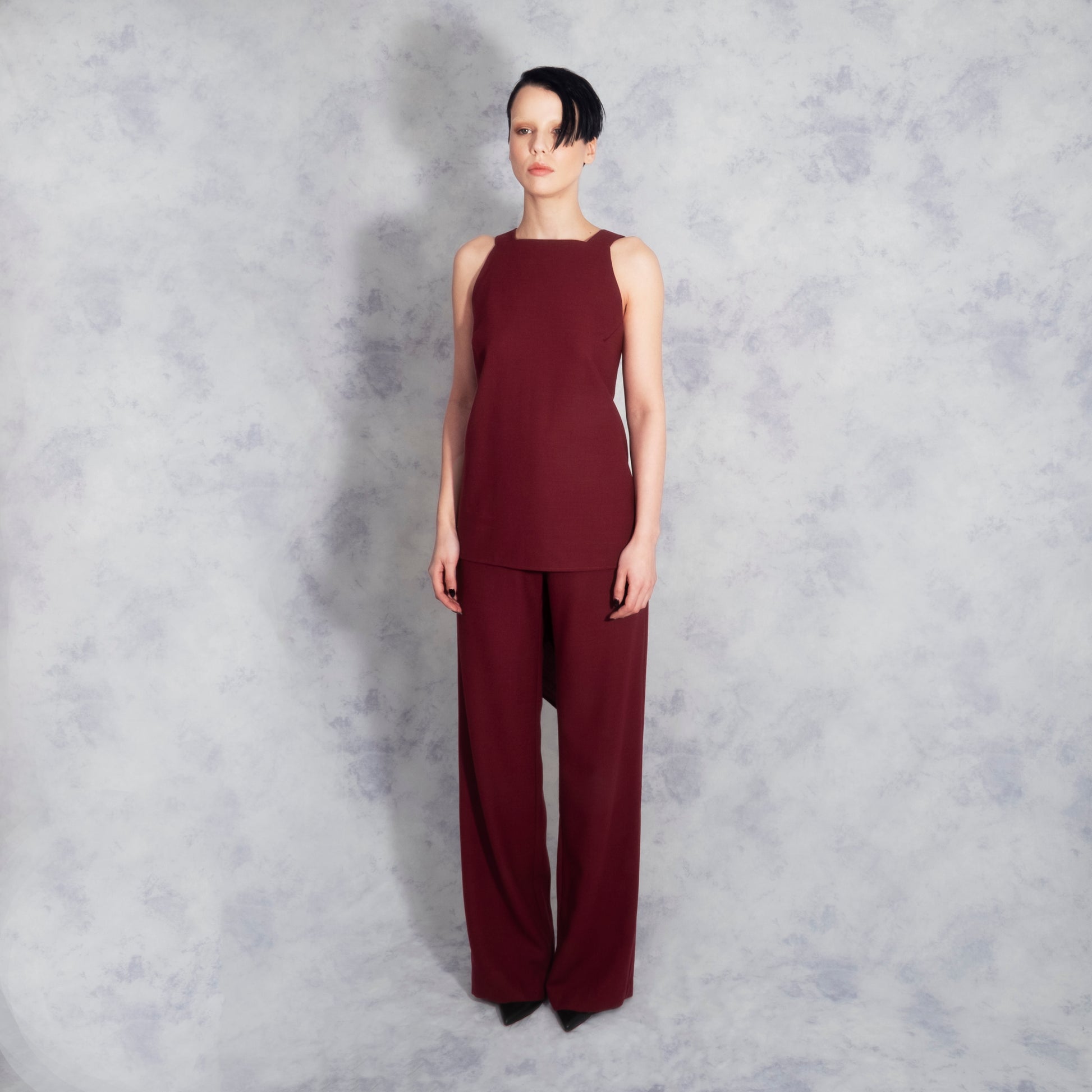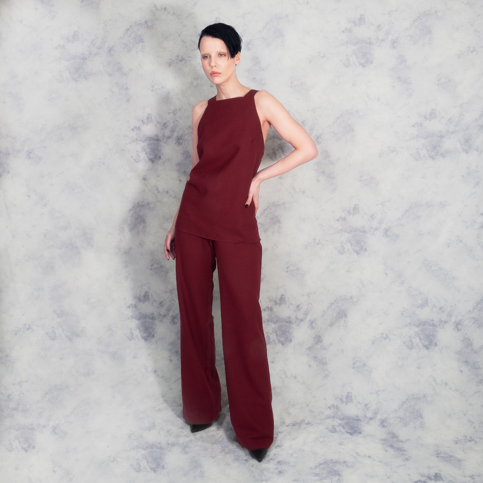 Elegant and comfortable apron-style top, with wide straps that criss-cross at the back. The top is backless with elongated panels at the back, creating a flattering tailcoat effect. Made from soft wool suiting fabric with excellent structure and drape.