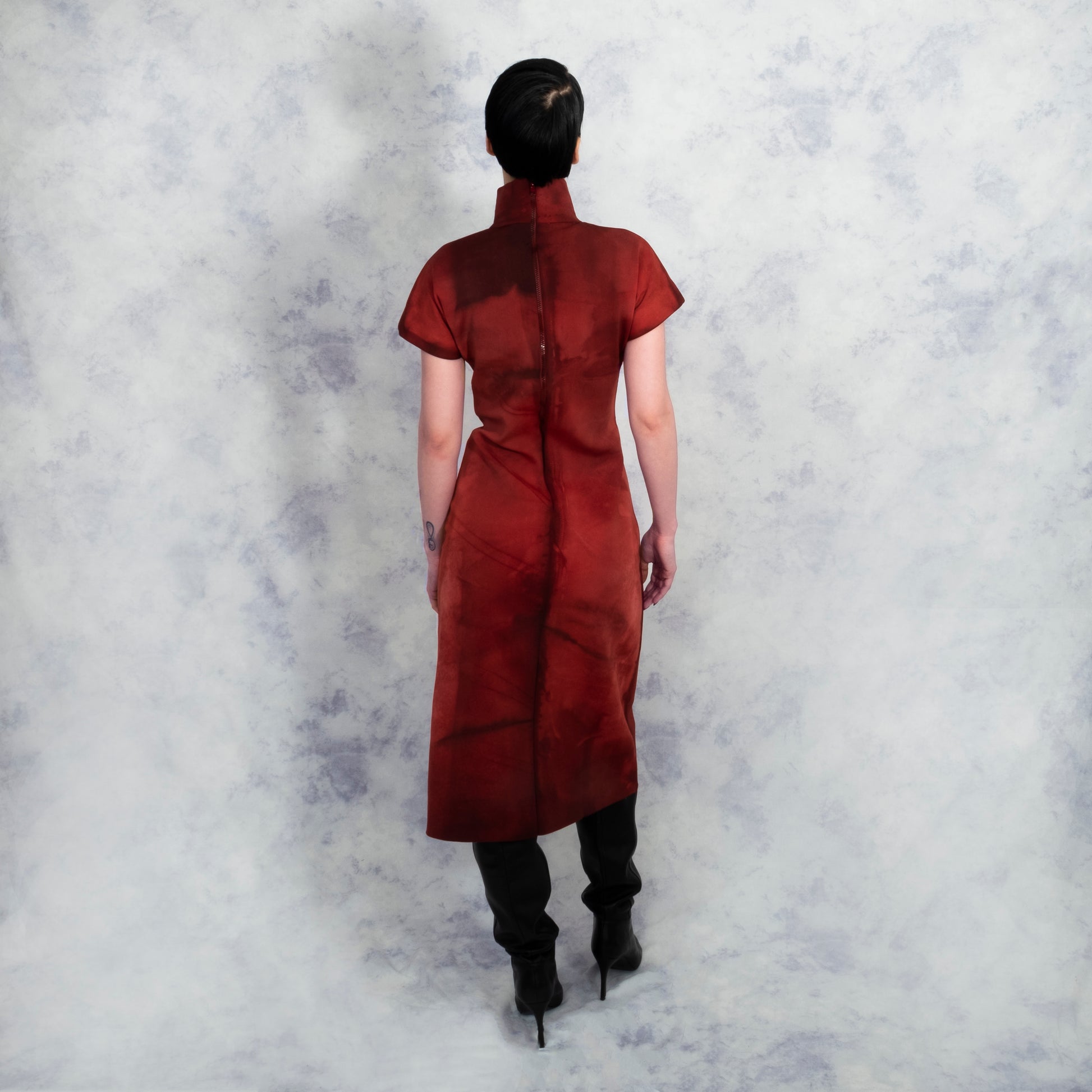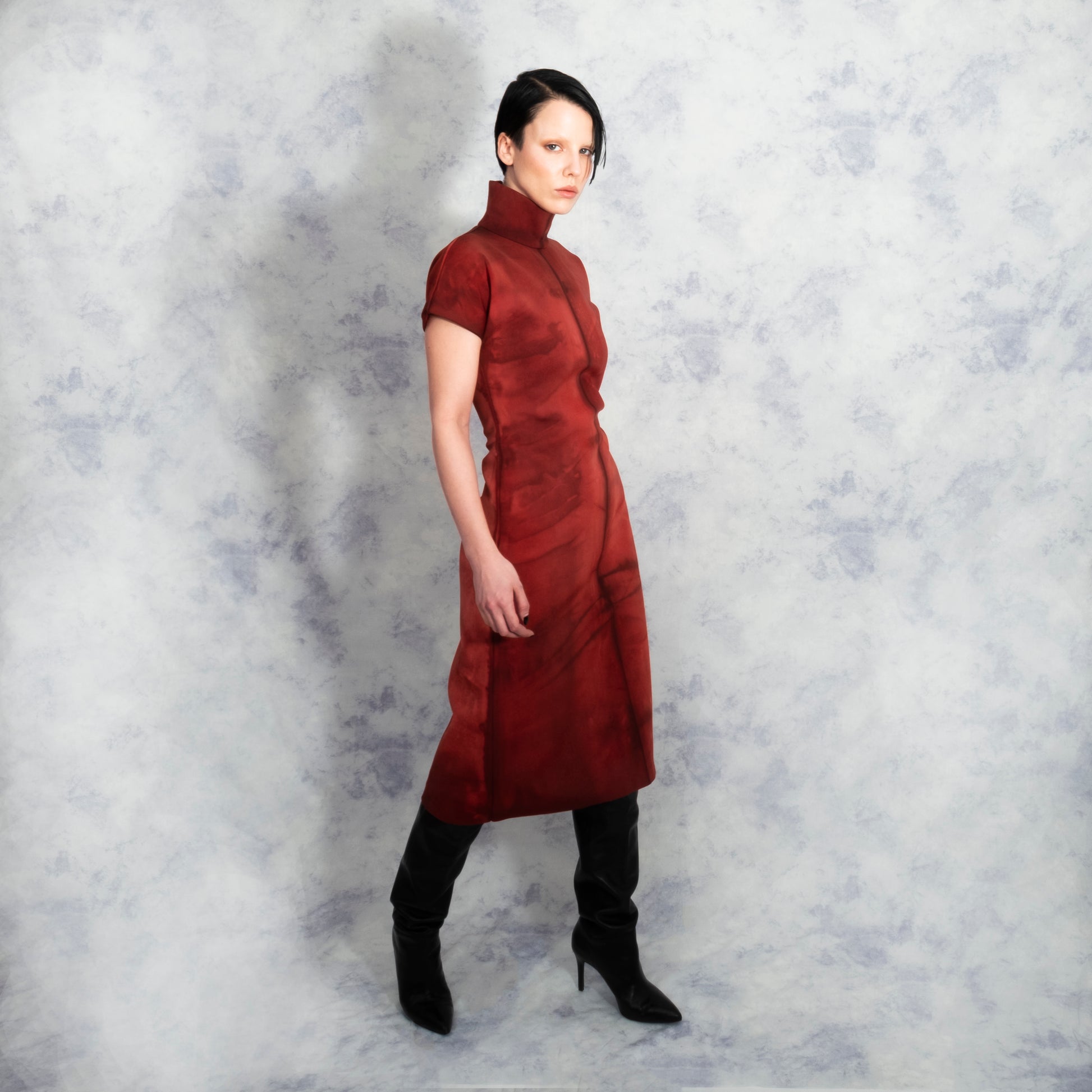 Stunning high neck dress with an individually hand-dyed pattern on both the front and the back, making each dress subtly unique and one of a kind. The dress has a concealed zip positioned in the center-back of the dress, allowing the wearer to step in and out of the garment with ease and comfort. Collared neck and kimono-style sleeves. Soft yet supportive neoprene fabric with a four-way stretch and a knitted cotton base layer.