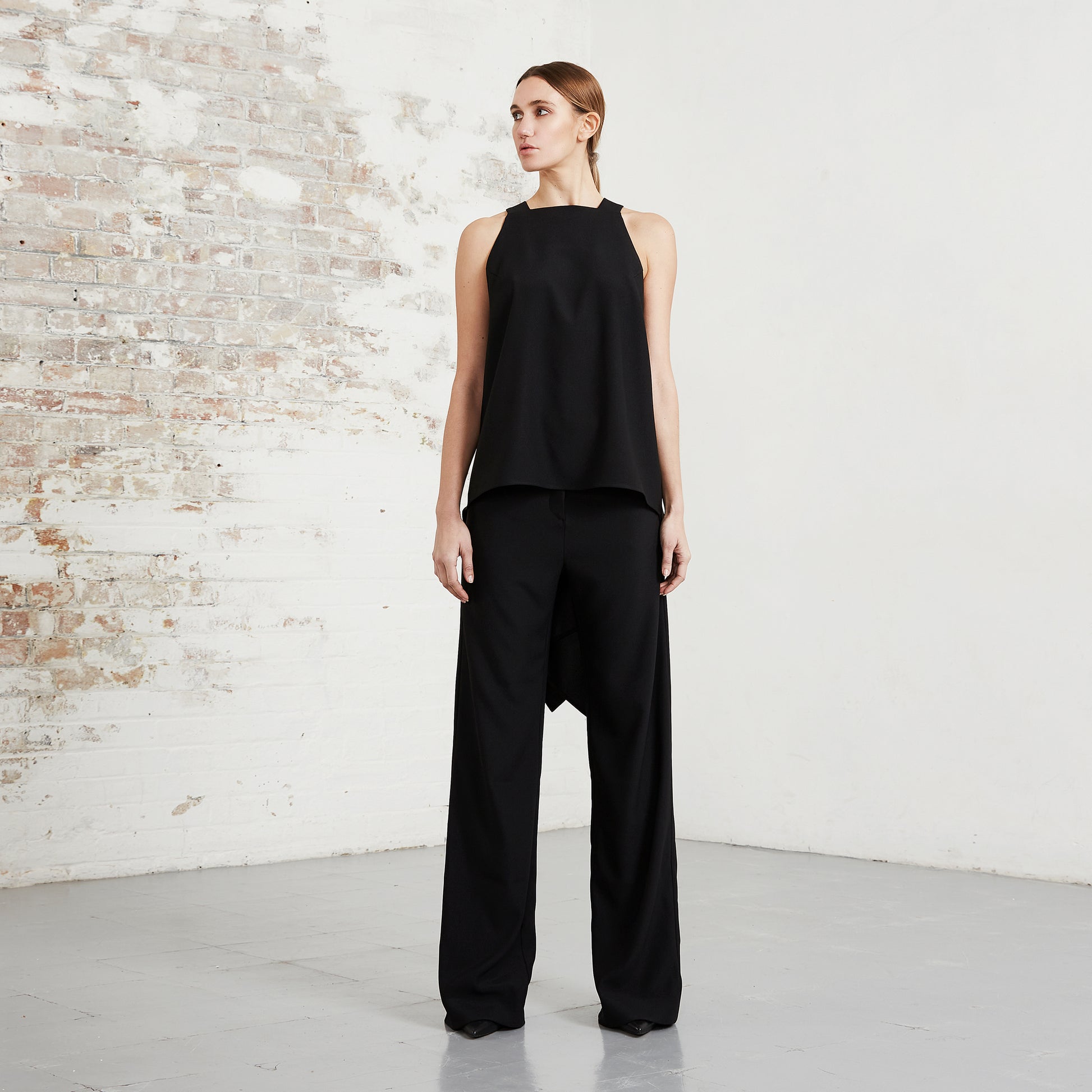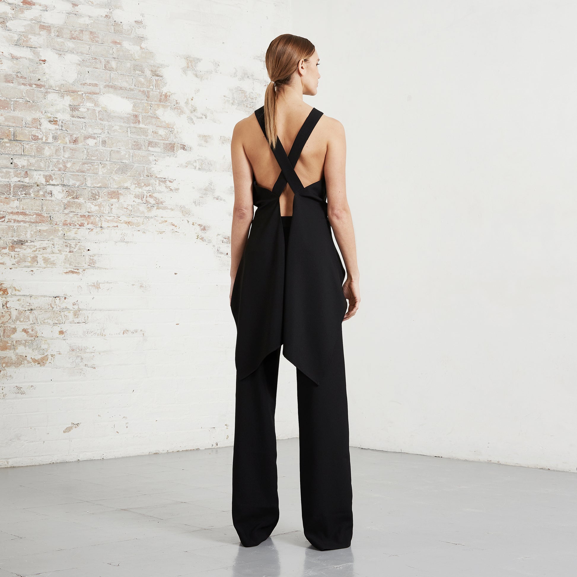 BLACK BACKLESS TUXEDO TOP
